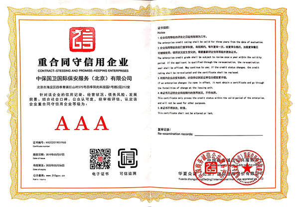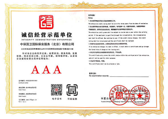 中保國衛(wèi)國際保安服務(wù)(北京)有限公司,屬中保國衛(wèi)集團(tuán)旗下子公司。能全方位的為大型客戶提供優(yōu)質(zhì)的安保、押運(yùn)服務(wù),是集人防和技防于一體的新型正規(guī)化綜合安保押運(yùn)服務(wù)企業(yè),提供人防、物防、技防、聯(lián)網(wǎng)報(bào)*、非武裝押運(yùn)等安防相關(guān)的一站式服務(wù)。 公司在國內(nèi)多省設(shè)立有分公司及分支機(jī)構(gòu),著重提升安全押運(yùn)、智能技術(shù)押運(yùn)及安全技術(shù)防范相關(guān)的服務(wù),業(yè)務(wù)范圍覆蓋全國一、二線城市、港澳地區(qū)以及海外地區(qū)。安保方面主要為政府機(jī)構(gòu)、金融機(jī)構(gòu)、企事業(yè)單位、醫(yī)療衛(wèi)生、高等院校、工業(yè)園區(qū)、大型商場、高檔住宅、智能商務(wù)樓、大型活動(dòng)提供門衛(wèi)、守護(hù)、巡邏、押運(yùn)(非武裝)、安全檢查、保安特勤、私人護(hù)衛(wèi)、消防中控、安全技術(shù)防范、遠(yuǎn)洋護(hù)航等全方位服務(wù),同時(shí)面向國際市場,為中資企業(yè)在“一帶一路”沿線國家投資提供境外安保服務(wù)。 >> 更多內(nèi)容 |